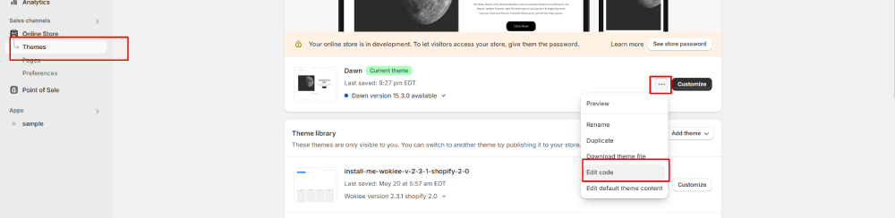 Find your current theme and click the Actions button. From the dropdown, choose Edit Code.